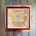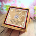 Imagine her reaction as she receives this beautiful Love Knot Necklace. Representing an unbreakable bond between two souls, this stunning pendant is adorned with premium cubic zirconia crystals, making it a timeless symbol of love and devotion. The luxurious box, featuring a meticulously preserved rose that never fades, adds an extra touch of love. With a simple turn of the gold knob, her breathtaking gift is revealed—making it the perfect sentimental gift for that special someone.